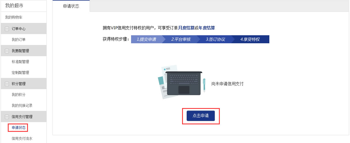 一、信用支付申请1、用户登录后点击页面左上角账号进入我的超市—信用支付管理—申请状态,尚未申请的用户显示状态为“尚未申请信用支付”。